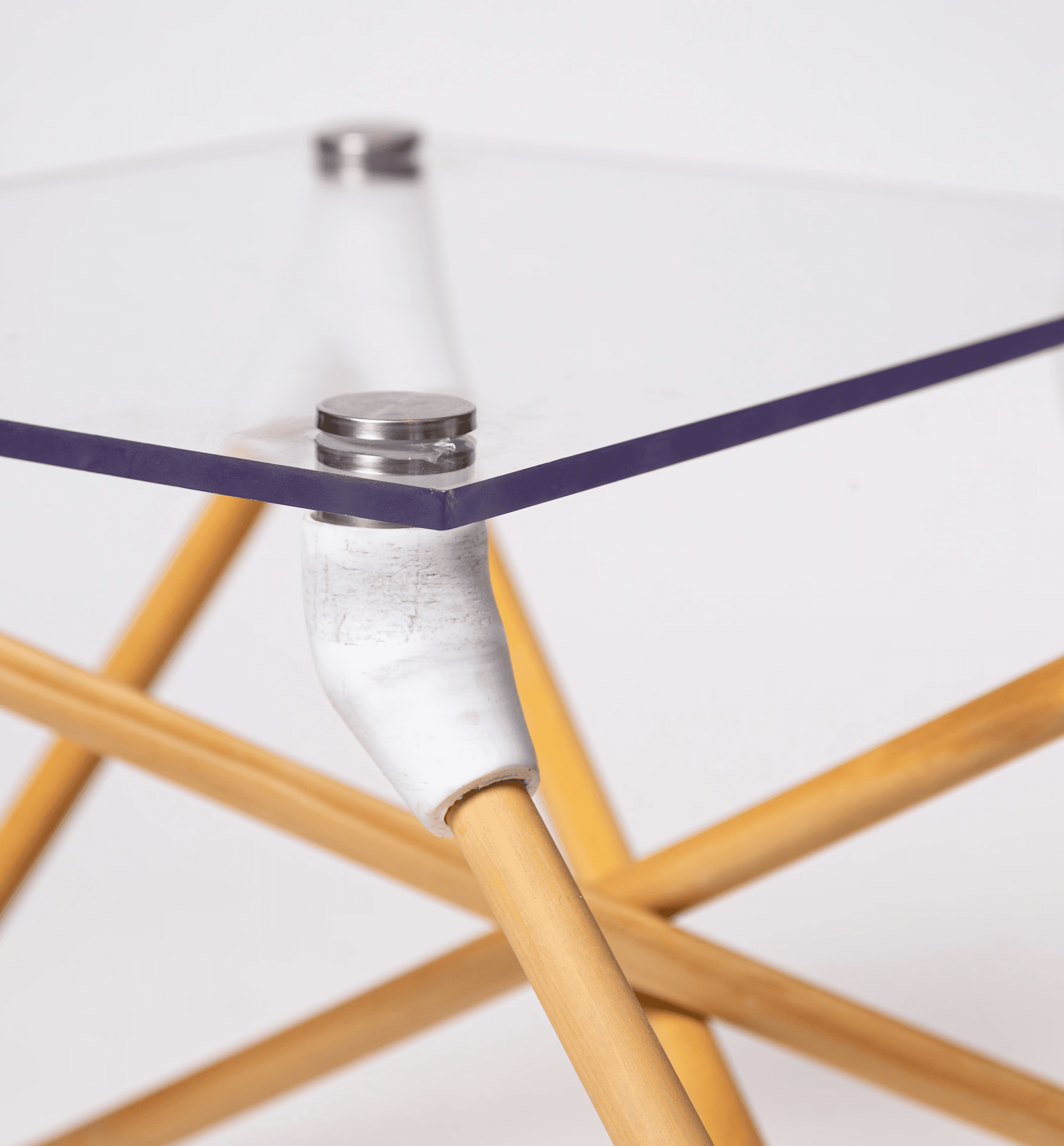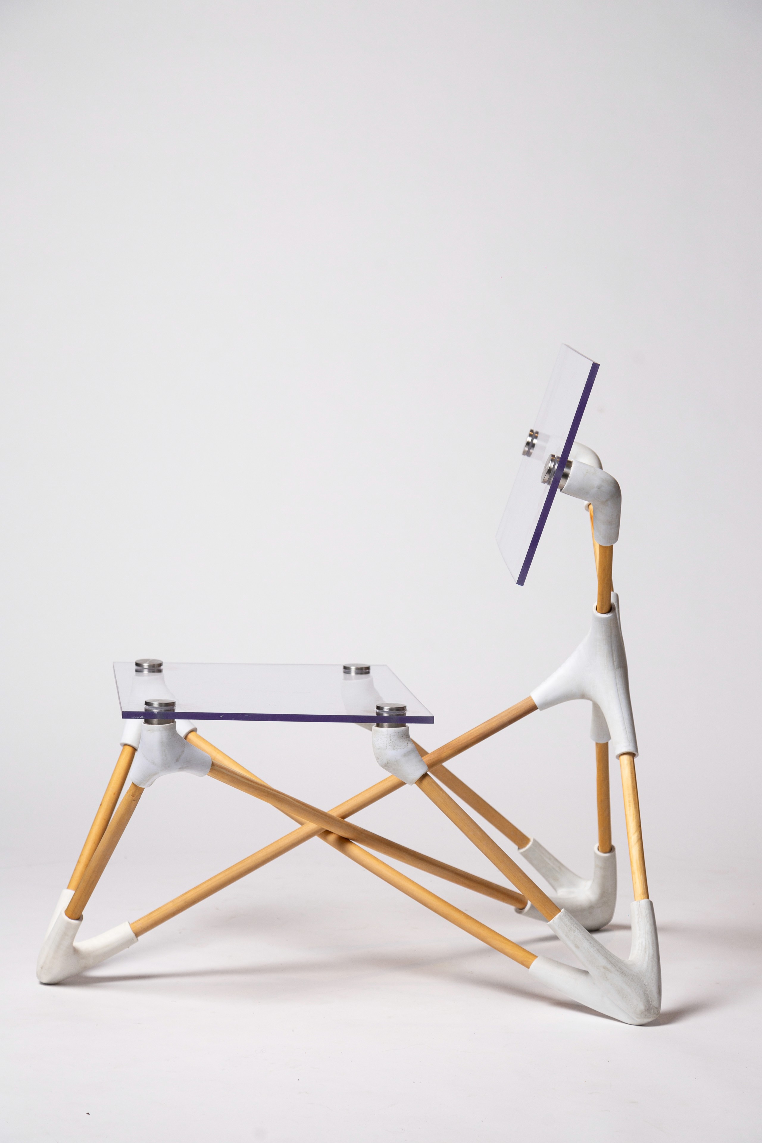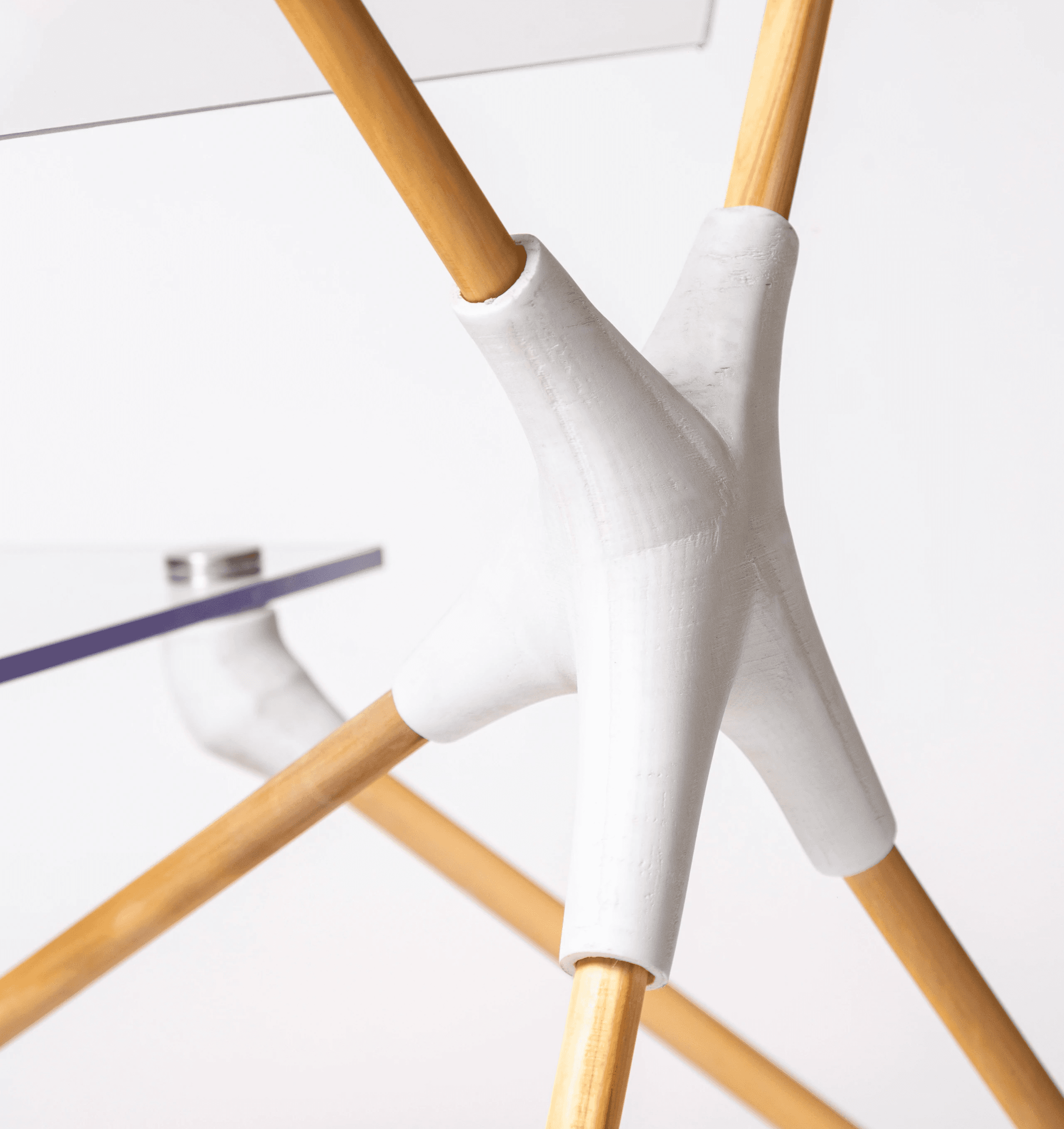 In this collaborative project, I served as the Technical Lead. My focus was on structural feasibility, including load calculations and dimensional analysis. I designed and 3D-modeled the white connecting nodes —printed in PETG— which act as both structural joints and aesthetic elements. I also oversaw the fabrication of the 'Palo Blanco' wood rods, which were turned for precision assembly and finished with linseed oil. The seat and backrest feature polycarbonate panels mounted via glass standoffs.